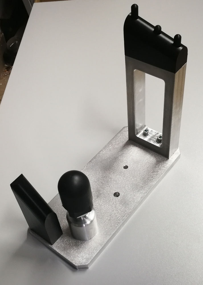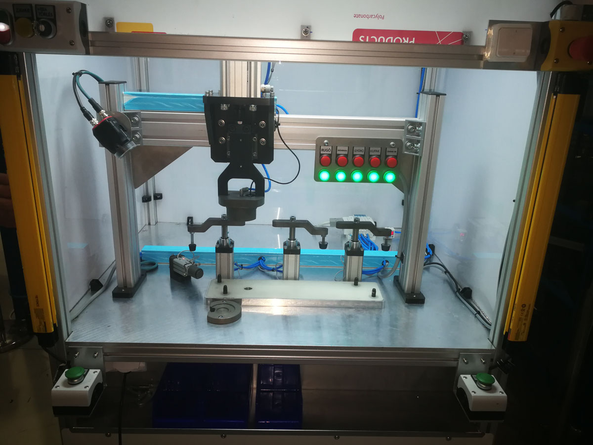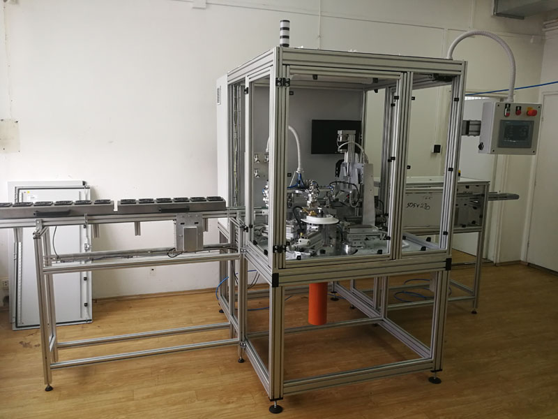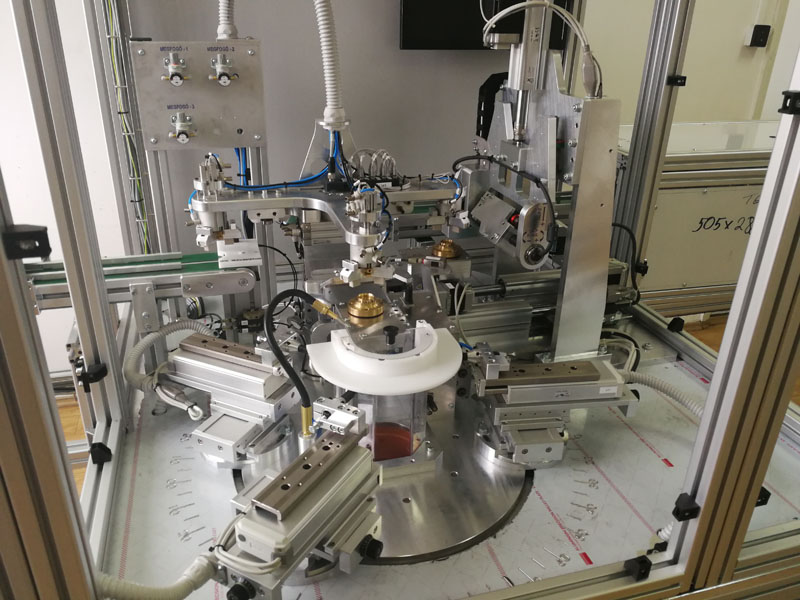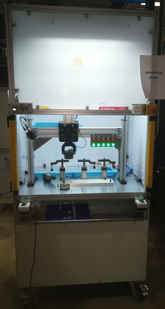 Alumínium profilos kerekes vázszerkezet, körbeburkolva alul porfestett lemezzel felül átlátszó polikarbonáttal. Munkadarab fészek: felfekvő felület szilikon gumi a megfelelő tömítés érdekében, edzett pozícionáló csapok a megfelelő tájolásért, 3db pneumatikusan működtetett leszorítóval és egy tömítő munkahengerrel. Asztal alatt egy vákuumszivattyúval a beépített rugó és membrán pozícióban tartásához. Fészek felett egy alumínium profilos vázszerkezetű prés vákuumos sapka rögzítéssel. Kamerás rendszer az alkatrész meglét lekérdezésre. Vezérlés Siemens plc. Működtetés: Kétkezes nyomógomb biztonsági kétkezes relével fényfüggönyös biztosítással.
