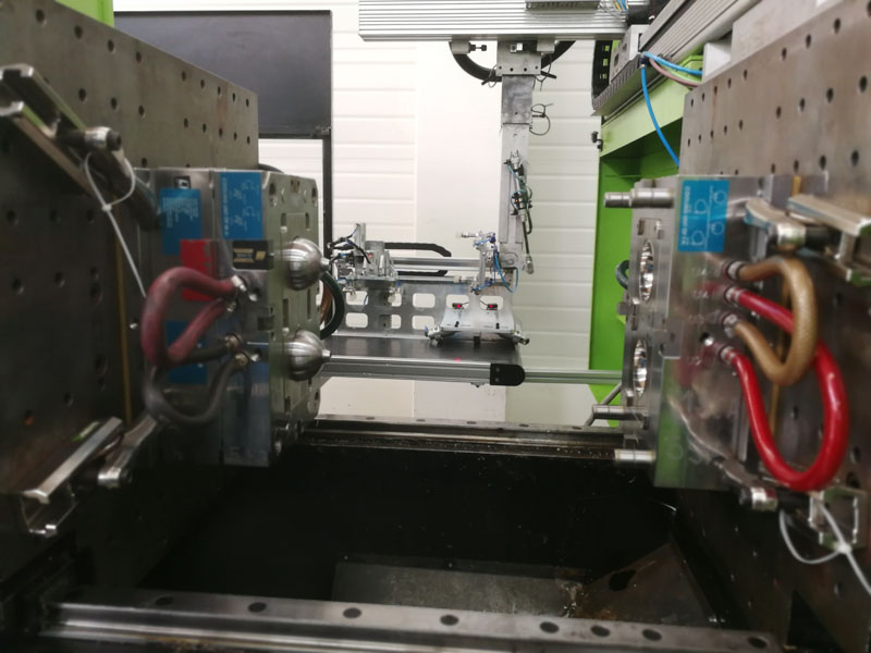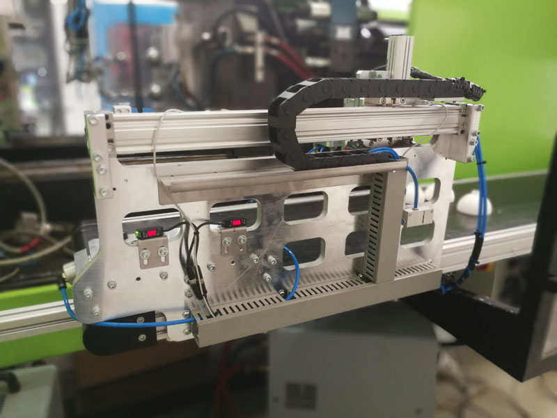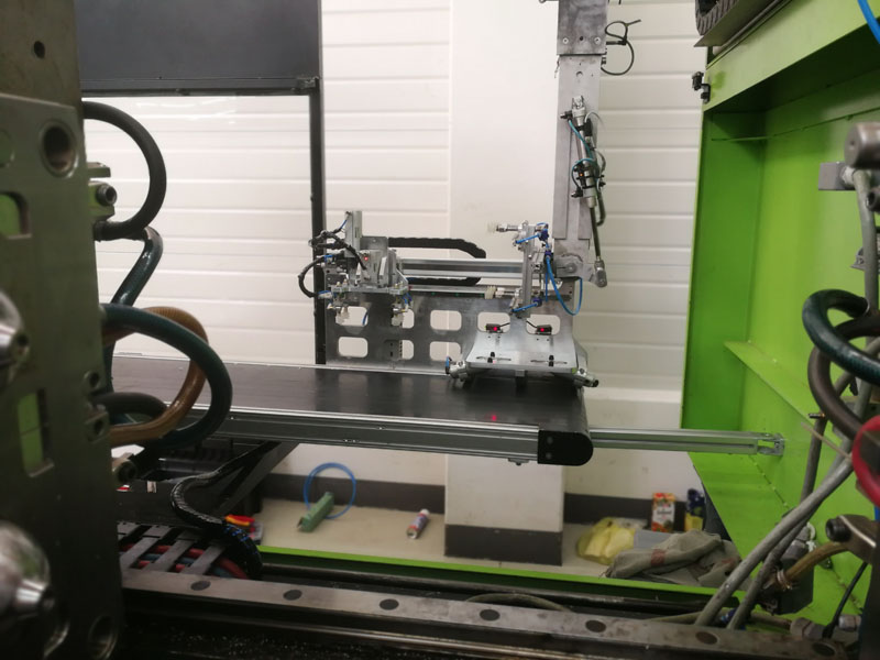 A fröccsöntés során keletkezet többletanyag automata eltávolítása. Az enguszvágó berendezés a kihordó szállítószalagra lett elhelyezve. A robot programozási korlátaiból adódóan a munkadarabot a robot a kivétel után a vágóra helyezi. Miután megtörténik a többletanyag eltávolítása a beintegrált vágó automatikusan kiveszi a fészekből a darabokat és a szalagra helyezi.